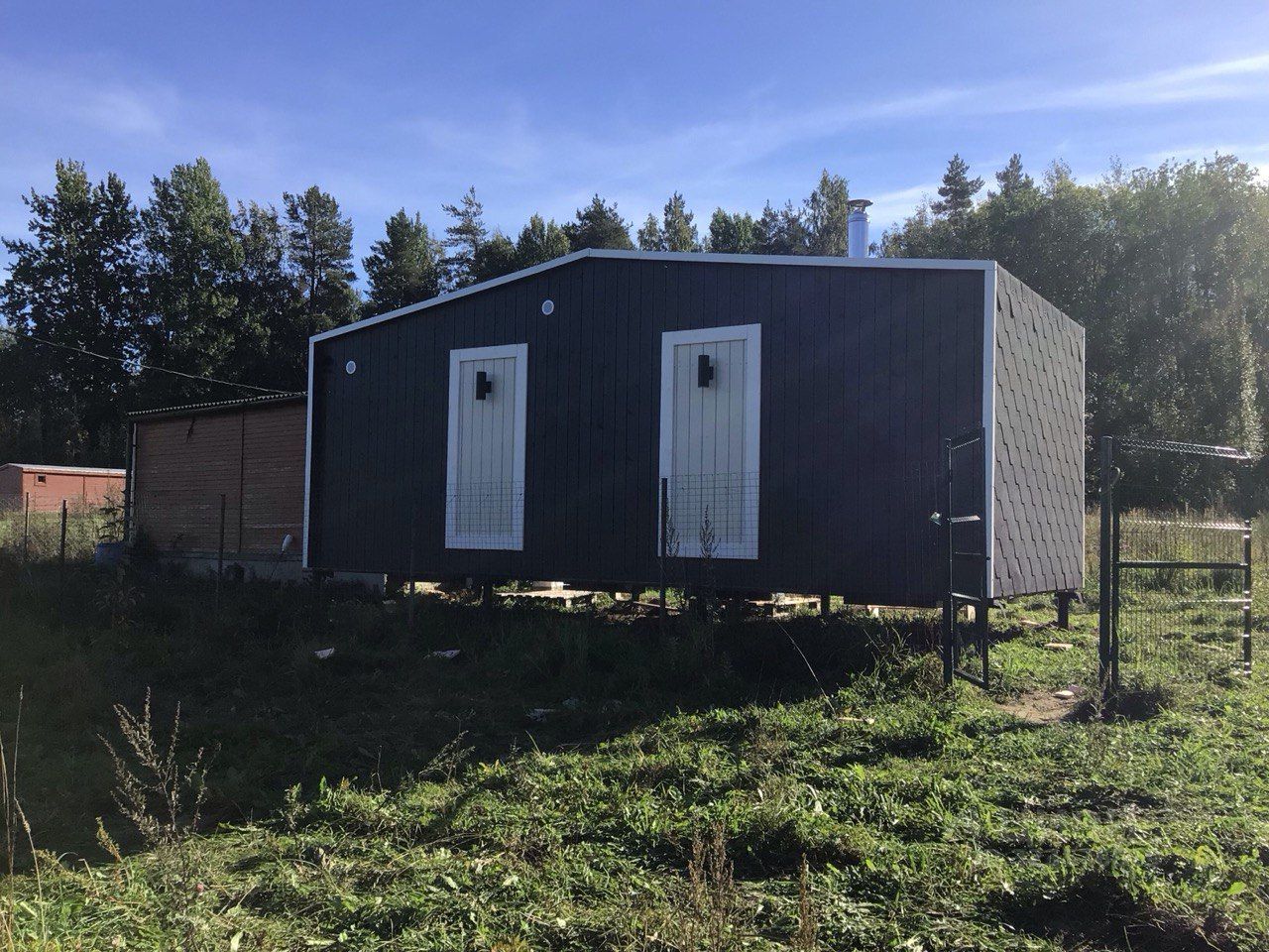 Есть постройки - модульная новая баня, хозблок и небольшая летняя кухня.