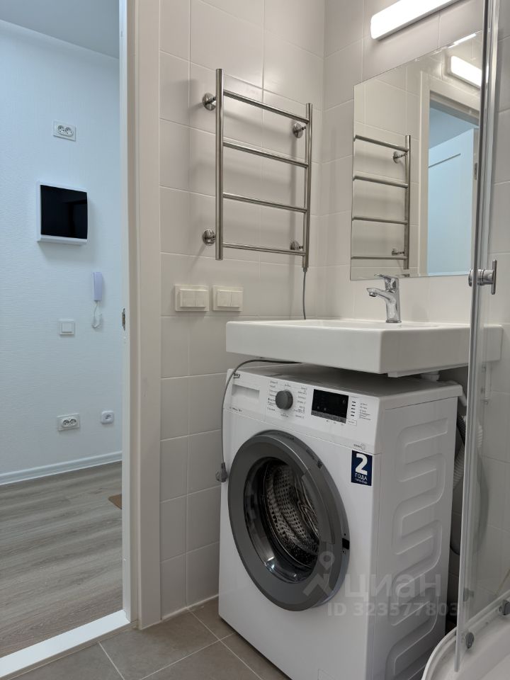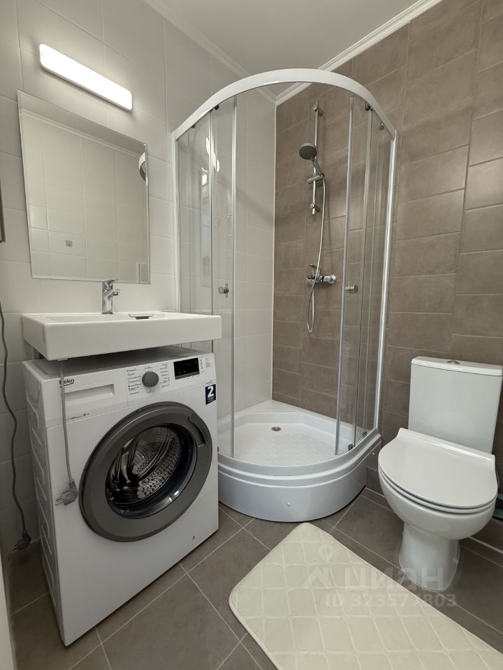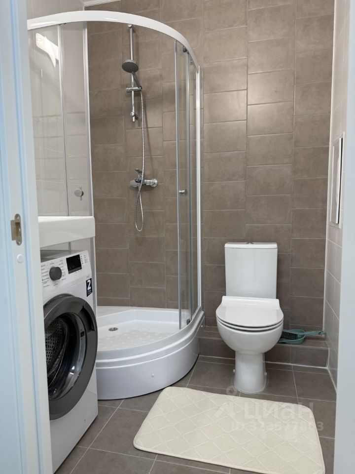Кухня оборудована необходимой мебелью и техникой, включая холодильник и стиральную машину. В комнате также есть мебель для хранения вещей и отдыха. Ванная комната оснащена душевой кабиной и совмещённым санузлом.