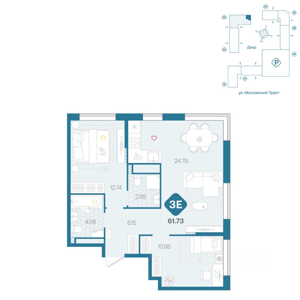Просторная трешка с окнами на две стороны. В квартире просторная прихожая с нищами под вместительные шкафы для хранения. Две светлых спальни. Гостиная площадью более 20 м² с угловым остеклением, нишей для приготовления, обеденной и гостиной зонами, а также нишей для рабочего места.