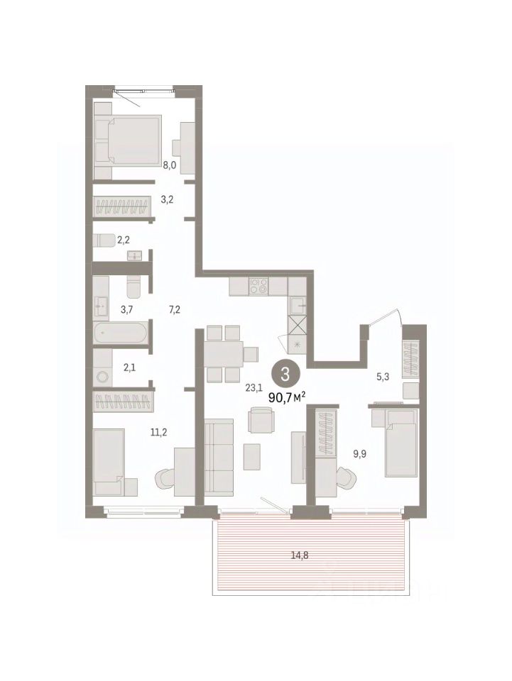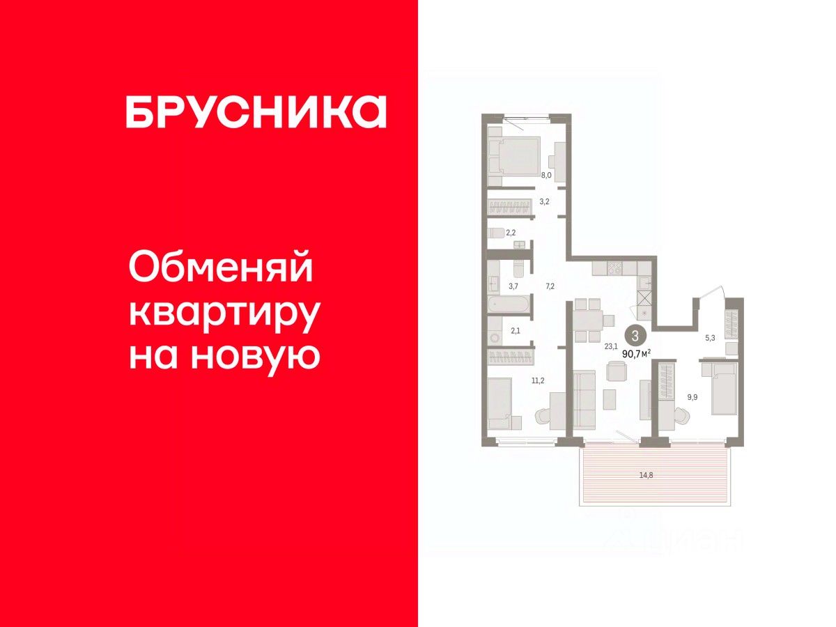 Квартира с кухней-гостиной и тремя спальнями в Южных кварталах. Особенности планировки: окна на две стороны, панорамное остекление, предчистовая отделка, разнесённые спальни. квартиры в нашей базе: ЮКВ08-Ж2.2.1.