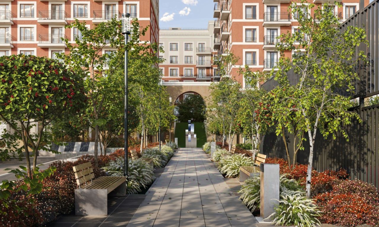 Двор с выходом в сквер Двор - это приватное пространство для жителей, закрытое от машин. В нём спроектированы детская и спортивная площадки, выполненные из натуральных материалов, а также зоны отдыха. Прямой выход в городской сквер расширяет функционал двора. Жители смогут быстро попадать в общественную зону с фонтаном, детскими и спортивными площадками и местами для отдыха. Большую часть территории двора занимает зелень. Озеленение выполнено в стиле пэчворк, и вдохновлено техникой лоскутного шитья. Отдельные фрагменты ландшафта, подобно лоскутам, гармонично складываются в планировочные элементы, а затем формируют цельную композицию. Растения представлены различными видами деревьев, кустарников, а также цветущими многолетниками. Зелень и стены дома выступают в к