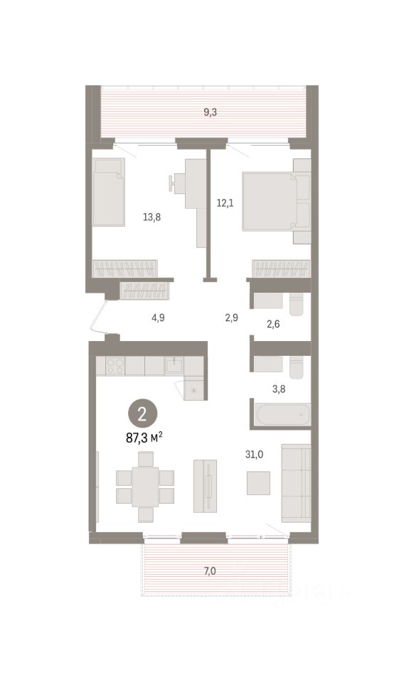 Квартира с кухней-гостиной и двумя спальнями в жилом районе ''Пшеница''. Особенности планировки: балкон, вид во двор, второй санузел, окна на две стороны, предчистовая отделка, разнесённые спальни, тёплая лоджия. квартиры в нашей базе: ПШЦ05.2-Ж3.3.6.