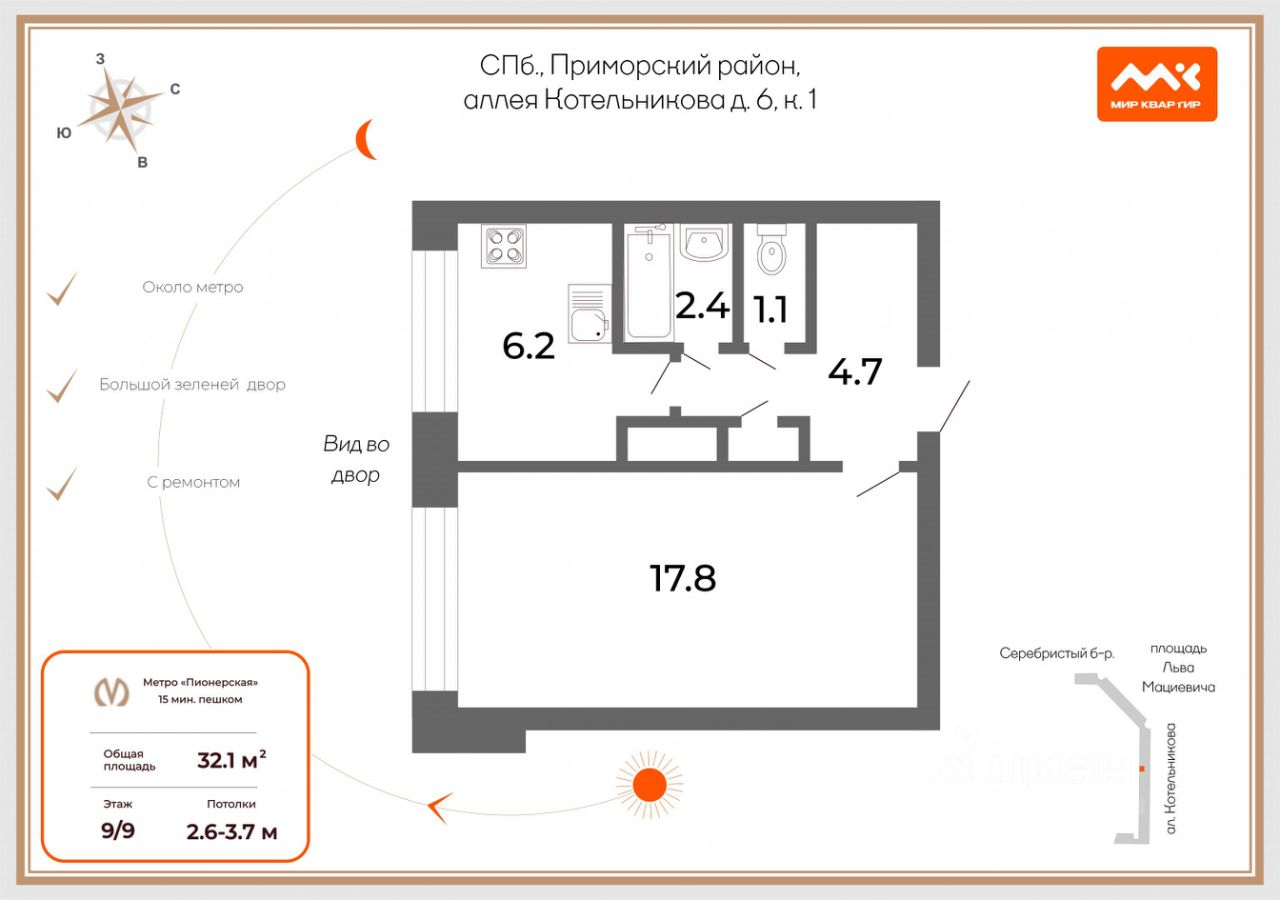 В продаже однокомнатная квартира площадью 32,1 м2 , с ремонтом и заменой коммуникаций в 2019 году. Квартира расположена на 9 этаже 9 этажного дома, сверху нет соседей, только технический этаж. Хорошая, грамотная планировка с открытой кухней 6,2 м2 и раздельным сан.узлом. Большая гардеробная с высотой потолков 3,7 м2 .