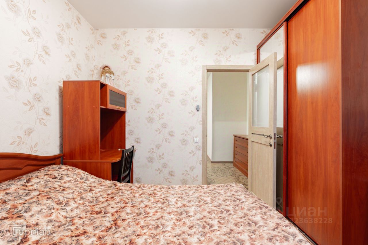 + Спальню (9,9 кв.м) удобно использовать как родительскую комнату. Большая кровать с матрасом, шкаф, туалетный столик, комод, карнизы и шторы.