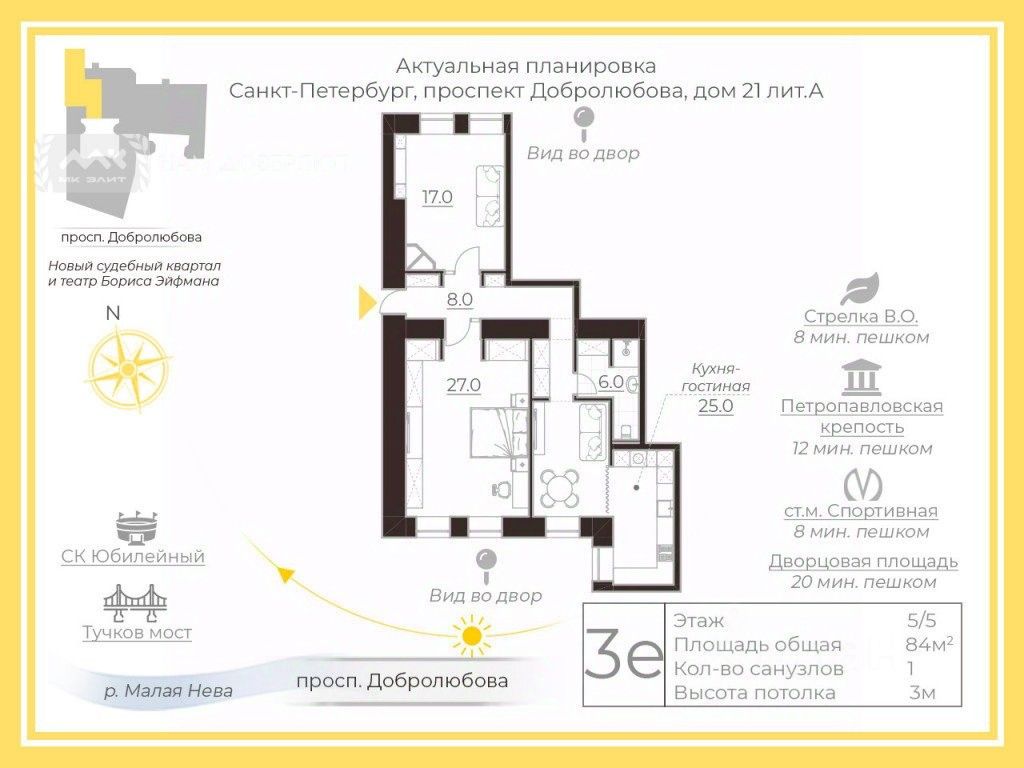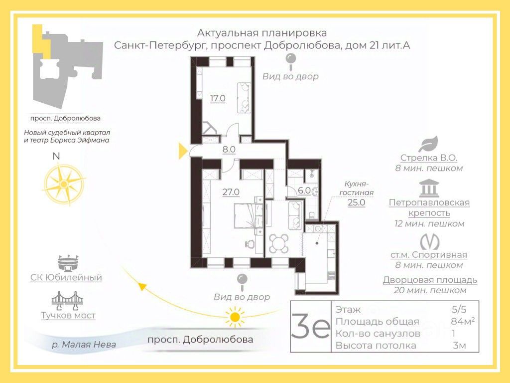 В 2-х минутах набережная и доминанты нашего города, напротив дома активно строится нашумевший судебный квартал, театр Бориса Эйфмана и прогулочная парковая зона, что однозначно повлияет на рост стоимости квартиры! Метро Спортивная в 5-ти минутах ходьбы.