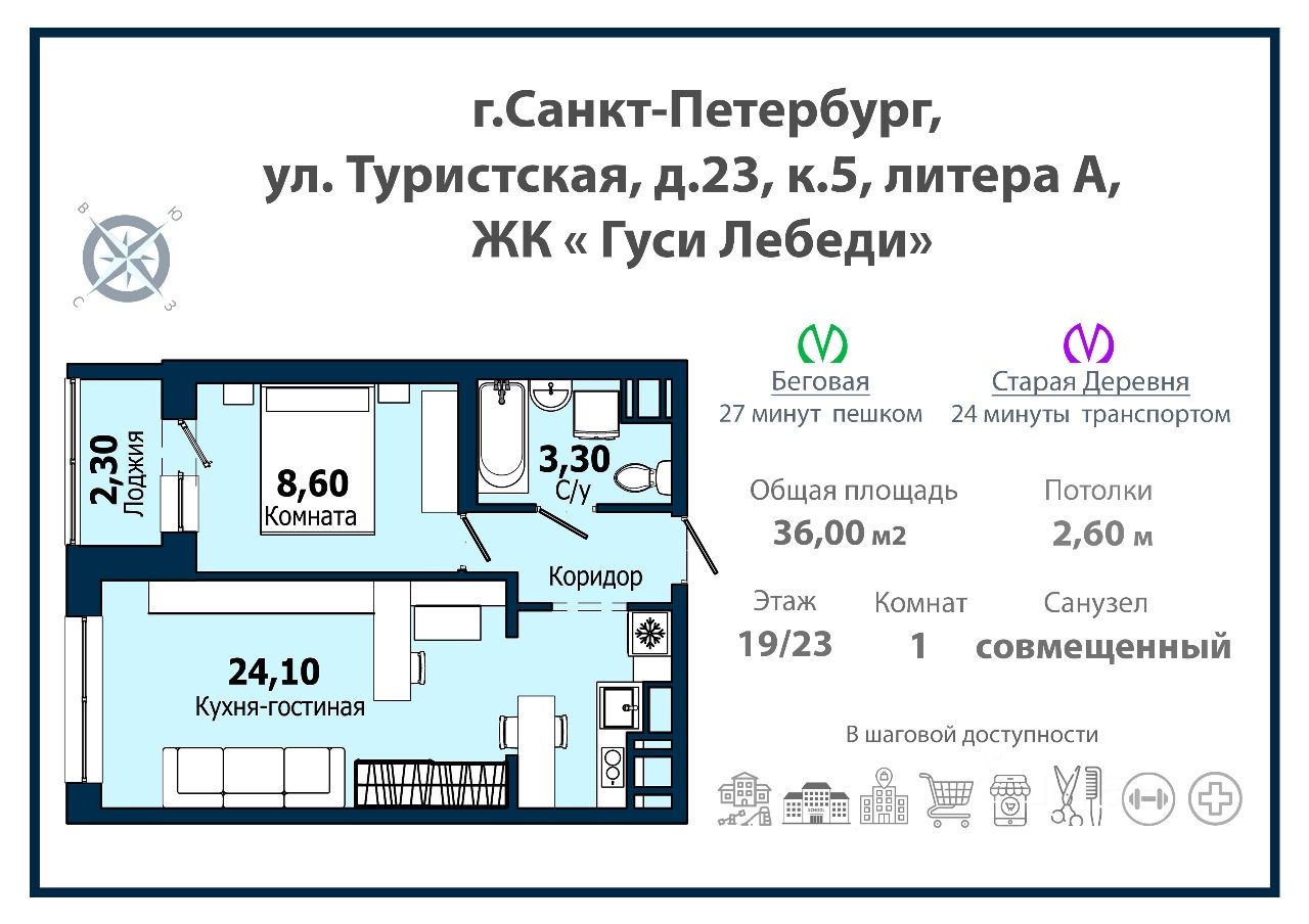 Удобное транспортное сообщение. До станции метро Беговая 20 минут пешком. До станции метро Старая Деревня 15 минут транспортом. В 2027 году открытие новой станции метро в 5 минутах ходьбы от дома. Рядом выезд на КАД и ЗСД, что позволяет быстро добраться до любой точки города и области.