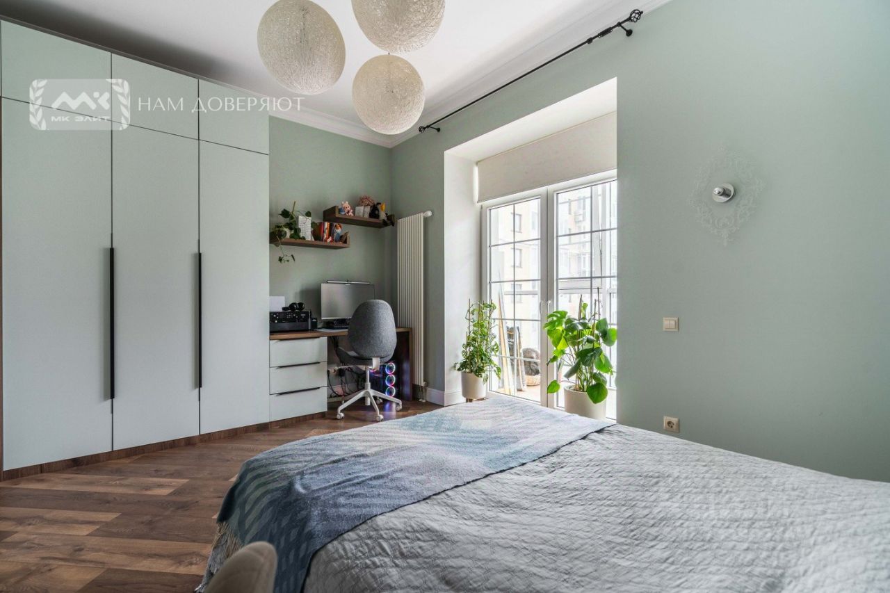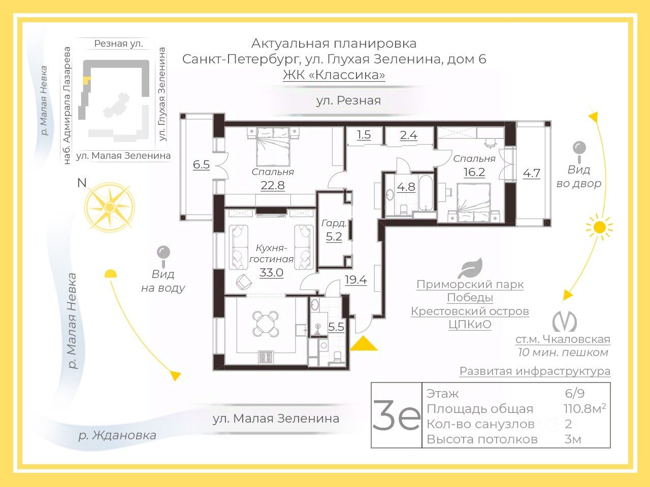 В квартире общей площадью 110.8м2 предусмотрены две отдельные спальни с просторными лоджиями, а также кухонная зона и гостиная. Двухстороння планировка продумана до мелочей здесь много зон хранения, включая вместительную гардеробную, два отдельных санузла (с ванной и душевой). Квартира располагается на 6 этаже, из окон открываются приятные виды: окна кухни-гостиной и основной спальни выходят в сторону Малой Невки, вторая спальня в тихий закрытый двор. Высота потолков 3 м.