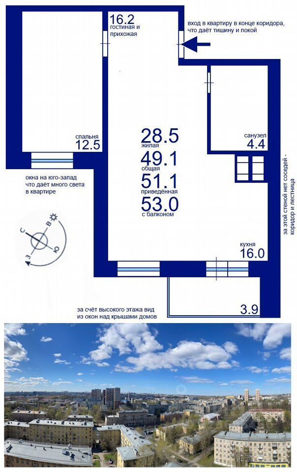 Продается уютная 2-комнатная квартира в Санкт-Петербурге по адресу: улица Седова, 42к2. Общая площадь — 49.1 кв. М, жилая площадь — 28.5 кв. М, кухня — 16 кв.