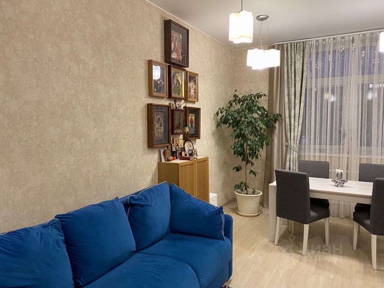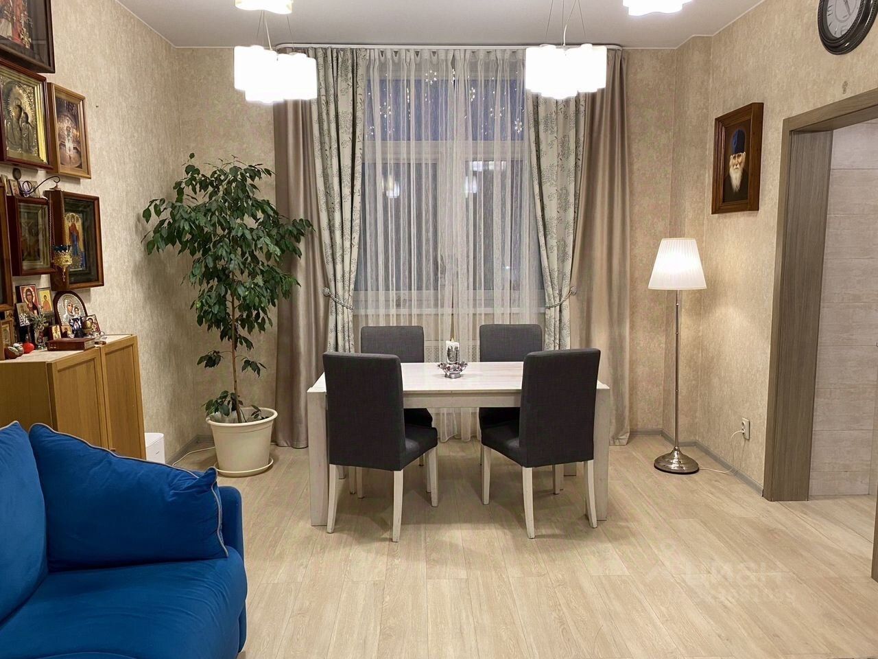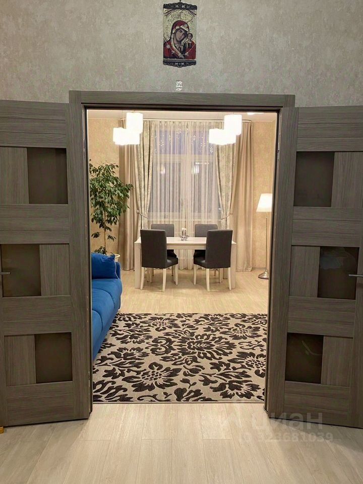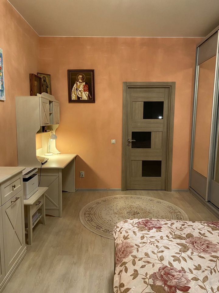 Квартира имеет удобную и продуманную планировку, комфортную для проживании большой семьи. Включает в себя: шикарную кухню- гостиную 26.5 м., и 2 изолированные комнаты правильной формы: 17.2 м и 26.3м, большой коридор 19.4 м. в коридоре под заказ выполнена система для хранения вещей в потолок. 2 санузла, один из них с большой ванной, качественная сантехника. Квартира меблирована, мебель вся остается.