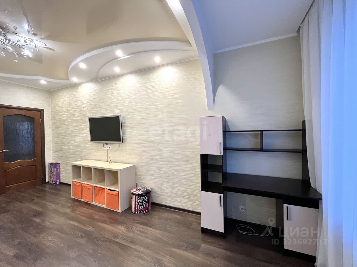 В гостиной расположен угловой раскладной диван, кресло, стеллаж, телевизор с кабельным ТВ, игровой и рабочей зоной.