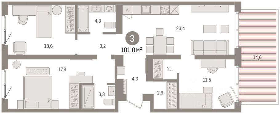 Квартира с кухней-гостиной и тремя спальнями в Южных кварталах. Особенности планировки: окна на две стороны, предчистовая отделка, разнесённые спальни. квартиры в нашей базе: ЮКВ08-Ж8.2.5.