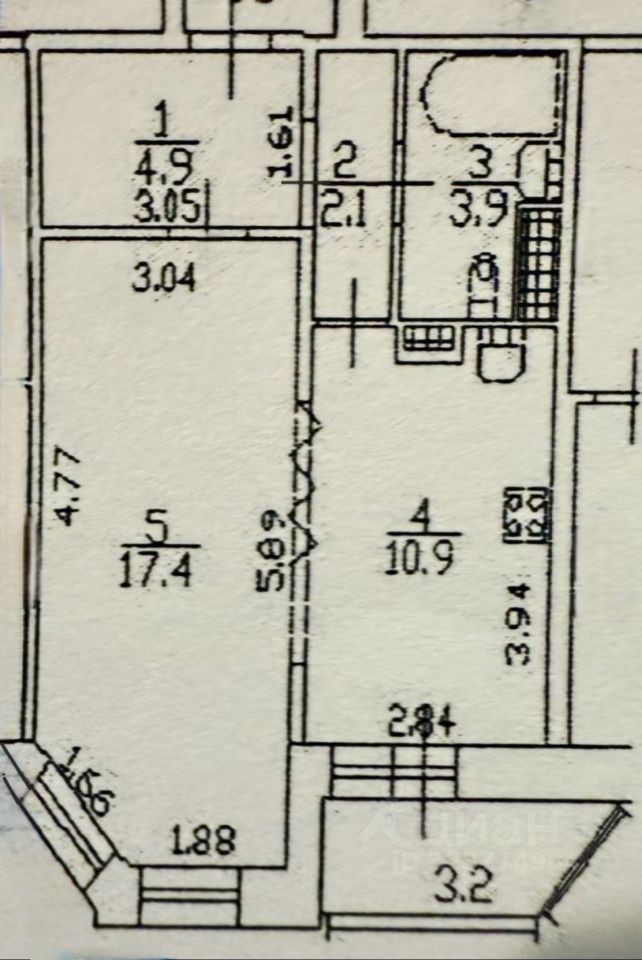 О КВАРТИРЕ: Общая площадь: 42.4 кв.м. Площадь застекленного балкона: 3.2 кв.м. Площадь кухни: 10.9 кв.м Площадь комнаты: 17.4 кв.м. Совмещенный сан узел Коридор: 4.9 кв.м. Вид из окон: во двор и на улицу