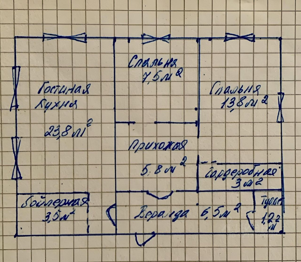 Планировка: Кухня- гостиная 23.8 кв.м. Две отдельные комнаты 13.8 и 7.5 кв.м. Гардеробная, бойлерная, туалет. Веранда 6.5 кв.м.