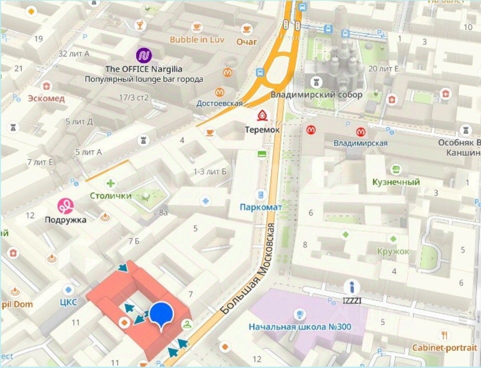 ** Престижный район с богатой инфраструктурой:** Рядом Владимирский собор, Кузнечный рынок, музей-квартира Достоевского, ''Пять углов''. Место с высокой проходимостью и узнаваемостью.