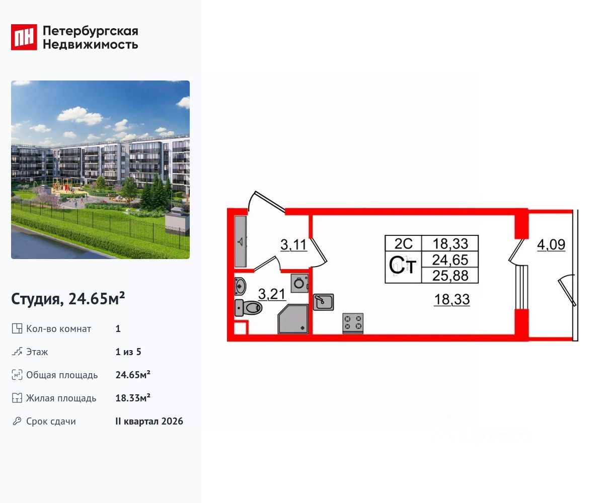 Удобная, классическая, функциональная европланировка, вместительная прихожая 3.11 м². Общая площадь студии - 24.65 м², жилая 18.33 м², высота потолка 2.77 м.