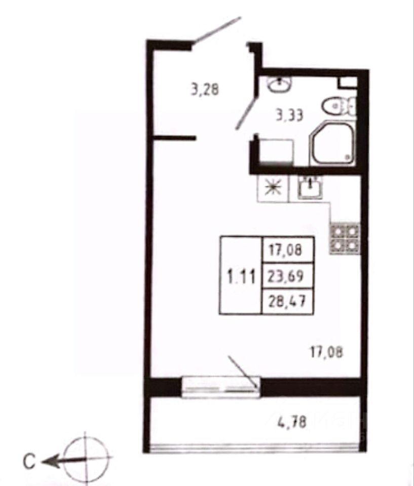Просторная квартира-студия, комната квадратной формы 17,08 кв.м., с просторной лоджией 4.78 кв.м. Мебель остается в квартире.
