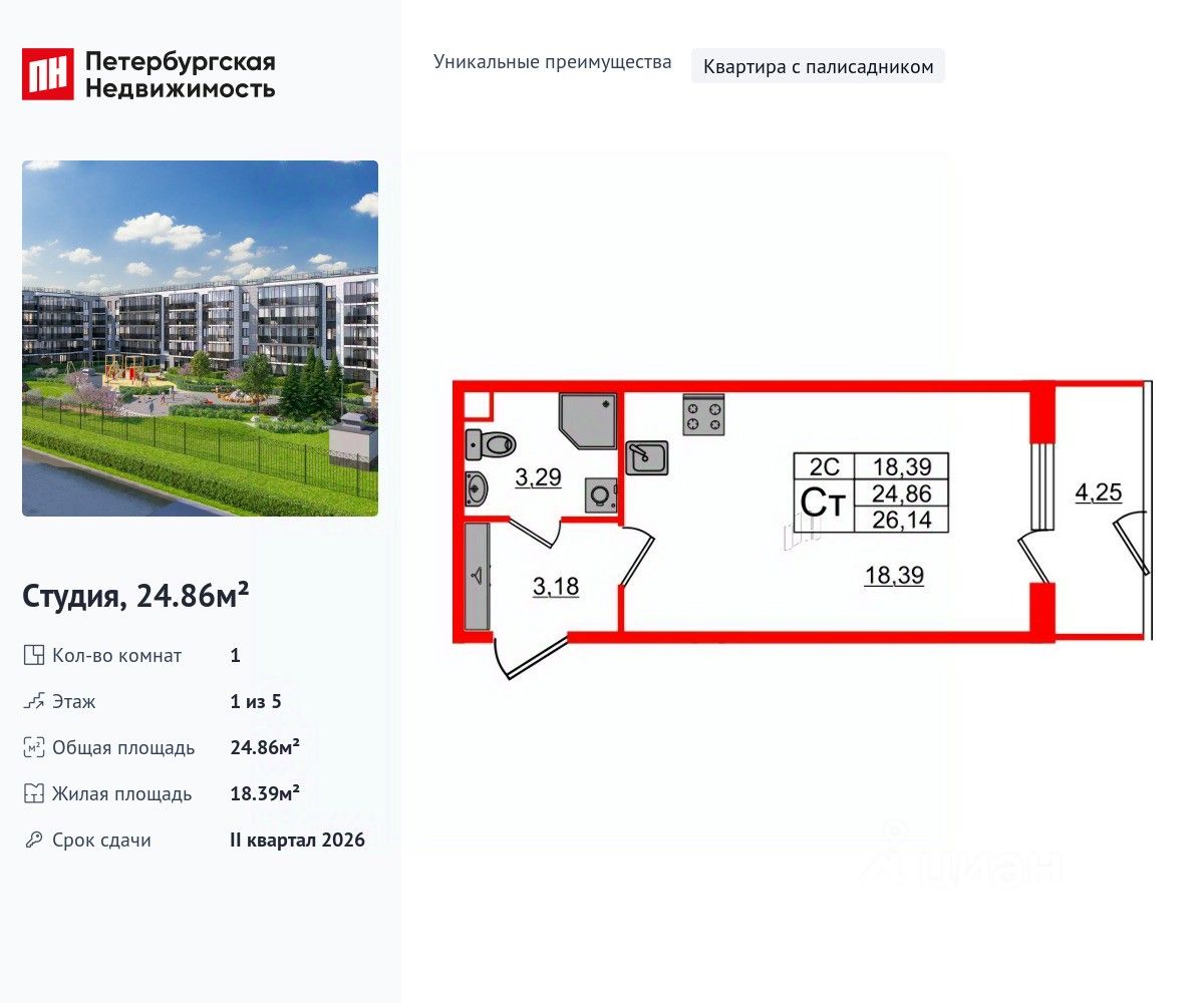 Уникальная, функциональная европланировка, вместительная прихожая 3.18 м². Общая площадь студии - 24.86 м², жилая 18.39 м², высота потолка 2.77 м.