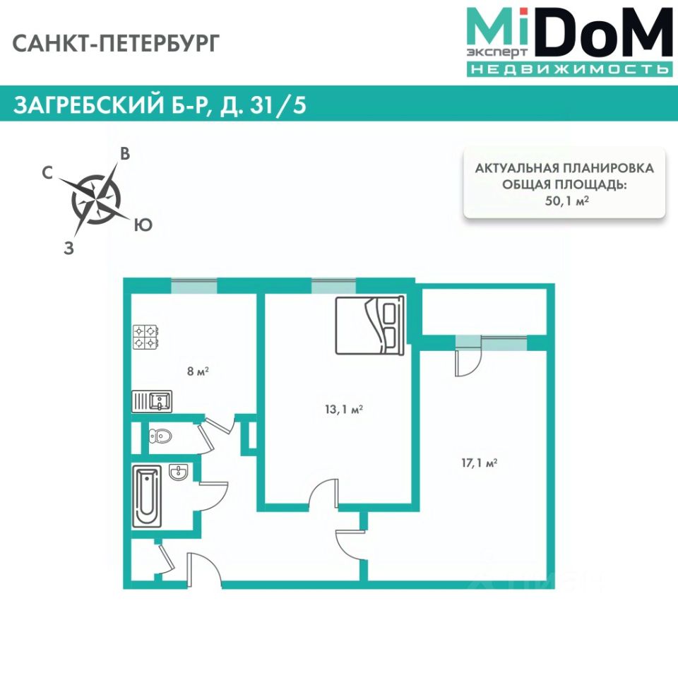 - Общая площадь 50,1 кв.м + застекленный балкон, изолированные комнаты (17,2+13,1 кв.м), просторный коридор, раздельный санузел.