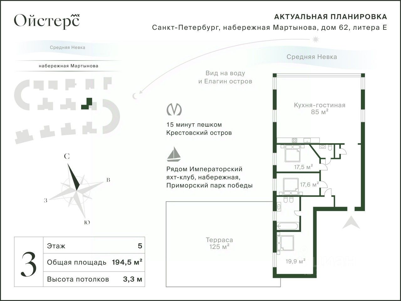 Общая площадь: 194.5 м² (квартира) + 125 м² (терраса в собственности) Этаж: 5, одна квартира на этаже Комнаты: 3 отдельные спальни Санузел: 2 раздельных Высота потолка: 3.3 м Парковка: 2 машиноместа в подземном паркинге (включены в стоимость) Ключевые преимущества: Уникальная терраса: Собственная терраса 125 м² с панорамными видами на воду и Елагин остров — идеальное место для отдыха.