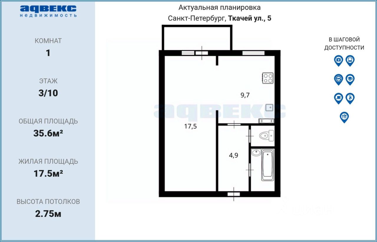 Планировка квартиры: • Просторная комната: 17,5 кв.м. • Функциональная кухня: 9,7 кв.м. • Большой застекленный балкон. • Раздельный санузел. • Окна выходят в тихий зеленый двор.