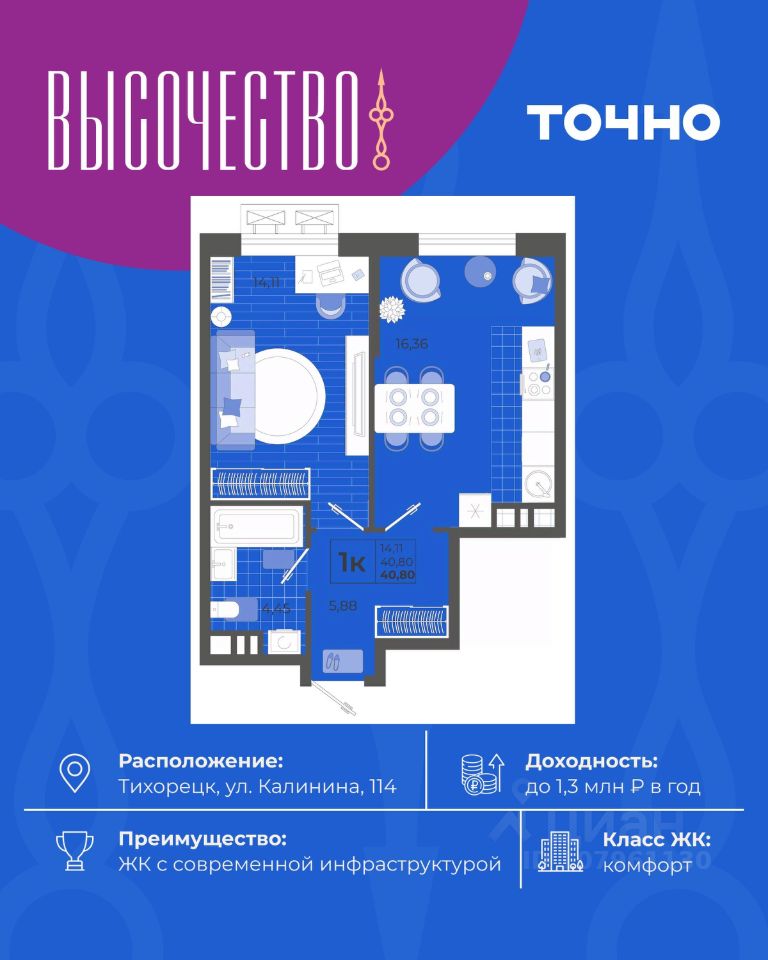 ''Высочество'' — первый ЖК комфорт-класса в Тихорецке. Современные технологии, новейшие представления о комфорте и эргономике жилья -это, то, что характеризует этот комплекс. Расположен в самом центре города. ''Высочество'' — это полностью самостоятельный жилой комплекс, жителей которого порадуют закрытый и свободный от машин двор, коммерческая галерея, спортивные и детские площадки с перголами для отдыха, уютная мангальная зона. По периметру жилого комплекса - открытый бесплатный паркинг на 370 м/мест. Недалеко от ЖК ''Высочество'' находятся детский сад, школы-гимназии, поликлиника, торговый центр, в пешей доступности расположен любимый сквер жителей города ''Звездный''.