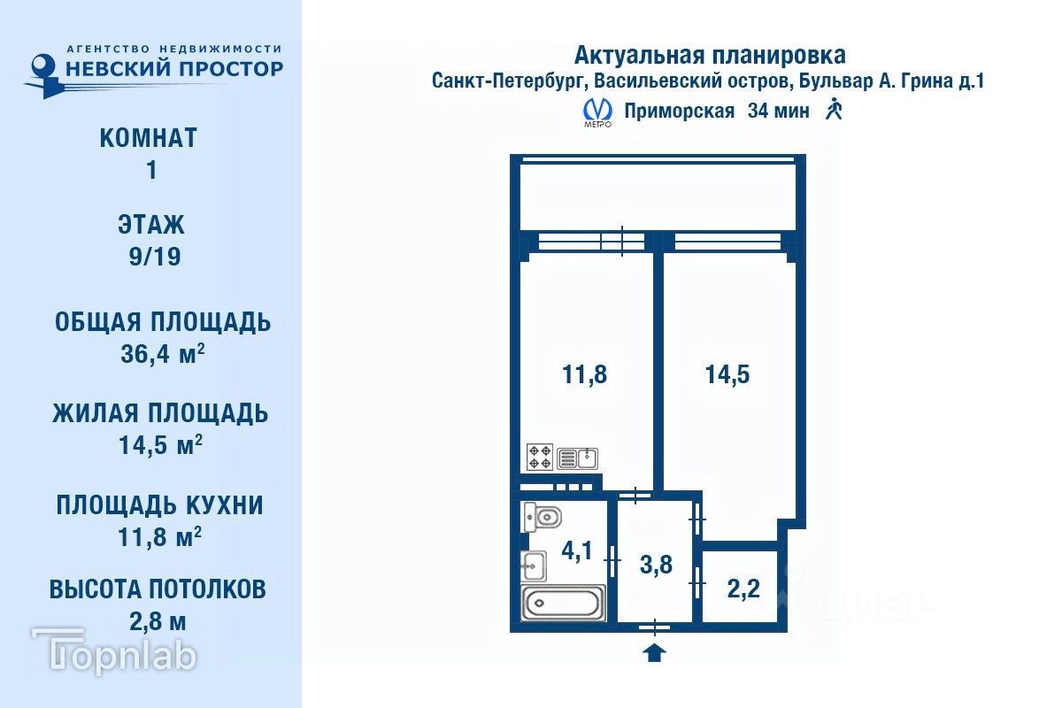 продам 1-к, Александра Грина бульвар, 17 960 000 ₽