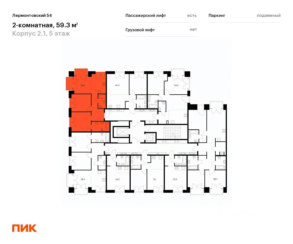 Продаётся 2-комн. квартира площадью 59,3 кв.м на 5 этаже 7 этажного дома (Корпус 2.1, Секция 7) проекта ПИК Лермонтовский 54. Светлый просторный подъезд на уровне земли, функциональная планировка, большие окна, без отделки.