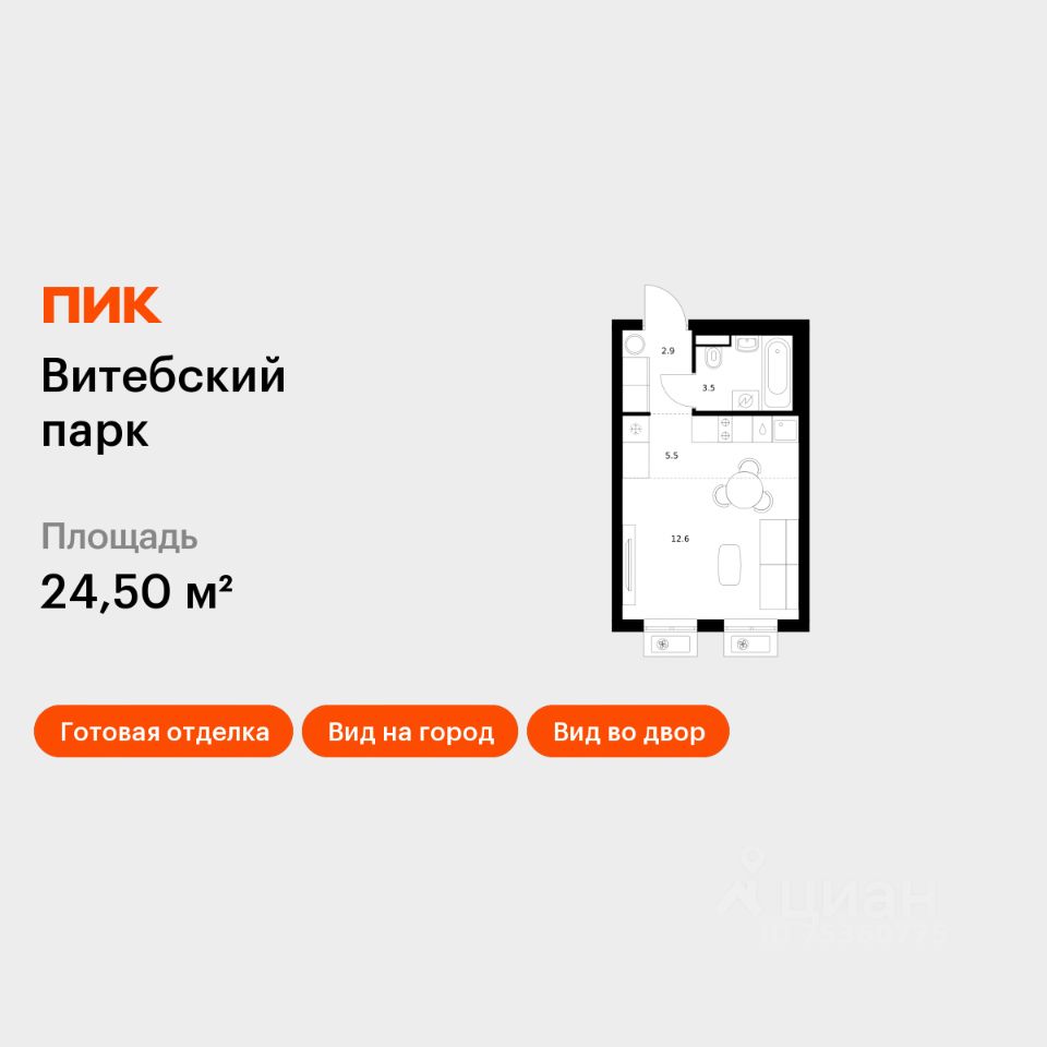 Продаётся квартира-студия площадью 24,5 кв.м на 9 этаже 12 этажного дома (Корпус 6, Секция 3) проекта ПИК Витебский парк. Светлый просторный подъезд на уровне земли, функциональная планировка, большие окна, c отделкой.