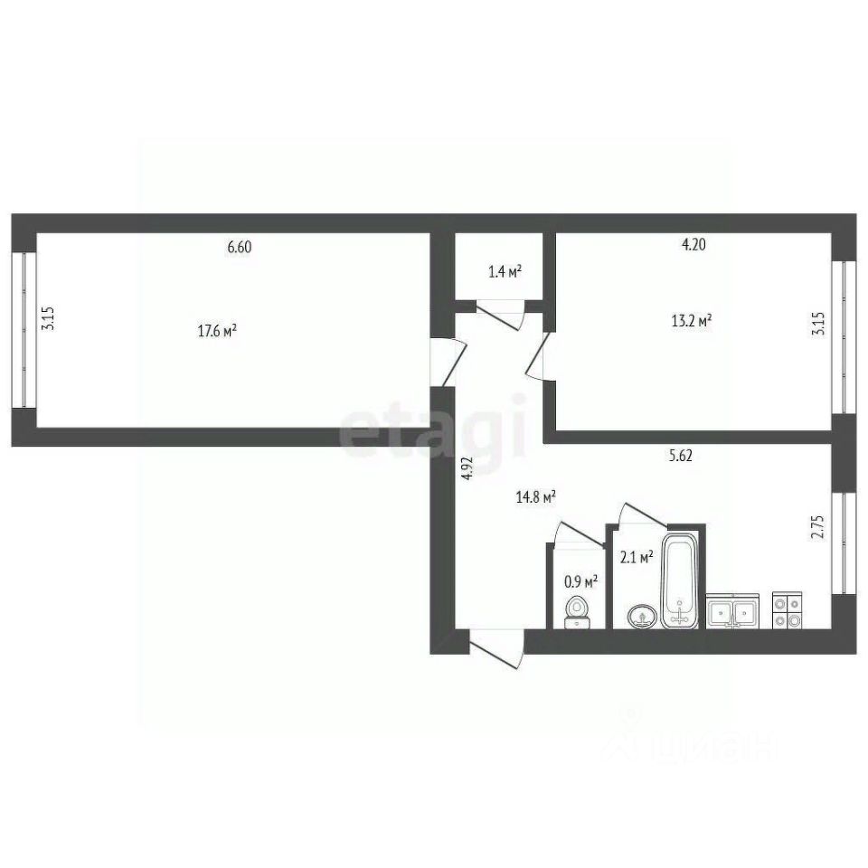 Комнаты просторные правильной формы 13,2 кв.м., 17,6 кв.м, кухня 6 кв.м., раздельный санузел, кладовая. Имеется выходной тамбур для одной квартиры 4 кв.м. ( в площадь квартиры не входит).