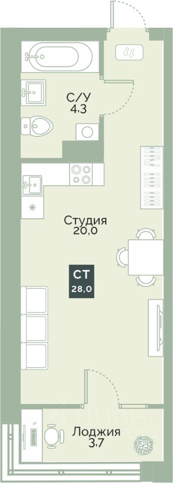 Квартира с предчистовой отделкой, с продуманной функциональной планировкой: комната 20м2, жилая площадь 20м2, высота потолка 2,76 м.