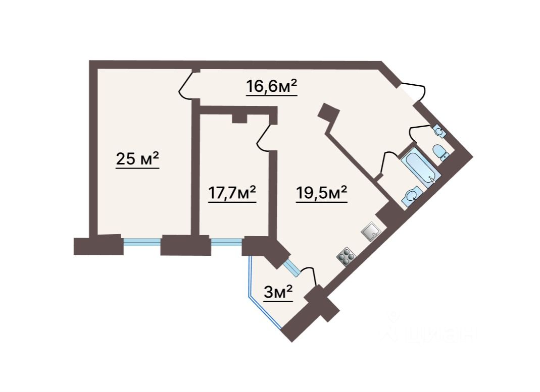 Большие комнаты 25 и 17,7 кв.м. Просторная кухня - столовая 19,5 кв.м.