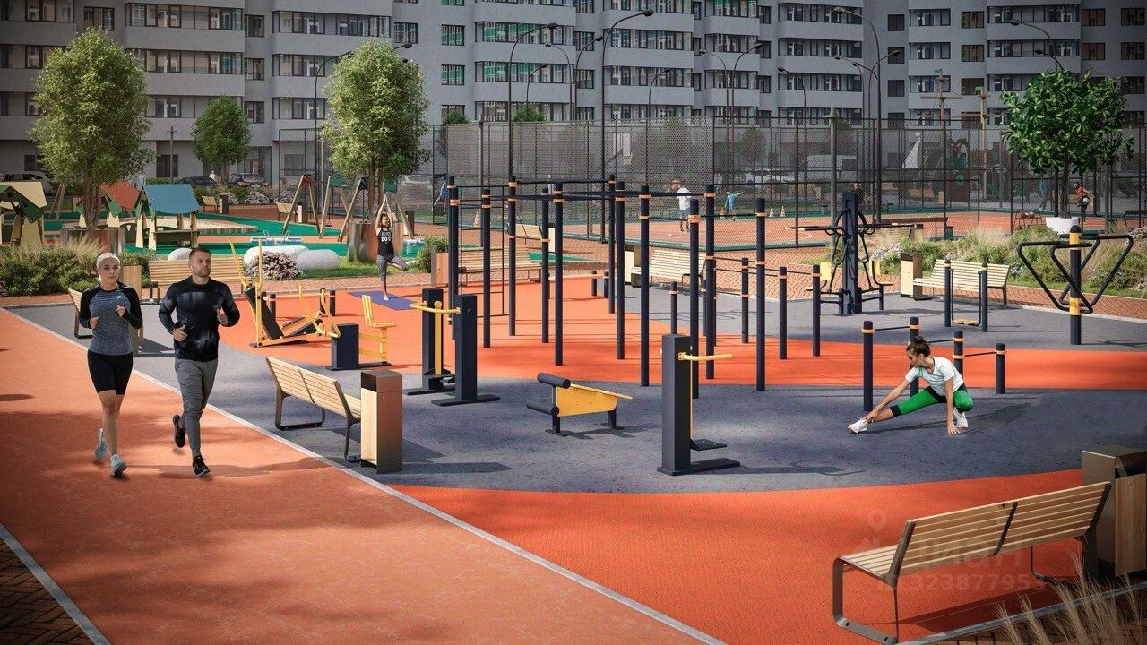 Одна из главных особенностей проекта двор в 2,8 Га, который по размеру сопоставим с четырьмя футбольными полями. Жители дома могут объединяться и проводить спортивные турниры по футболу, волейболу или баскетболу для этого есть два оборудованных корта. Для тех, кто предпочитает другие виды тренировок, организовано воркаут-пространство.