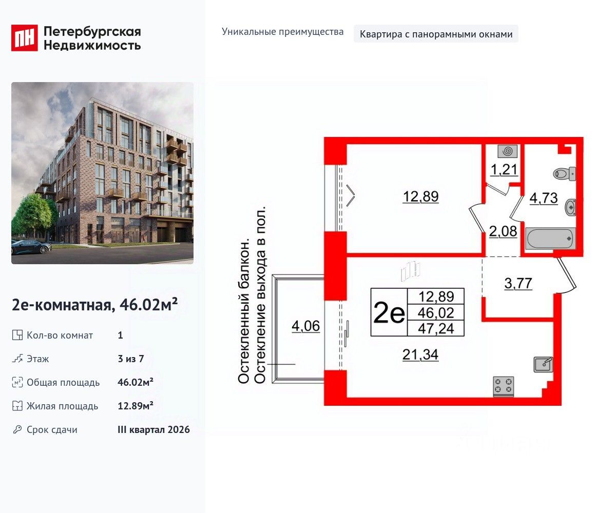 Уникальная, функциональная европланировка, большая кухня-гостиная 21.34 м², вместительная прихожая 3.77 м². Общая площадь квартиры - 46.02 м², жилая 12.89 м², высота потолка 3 м.