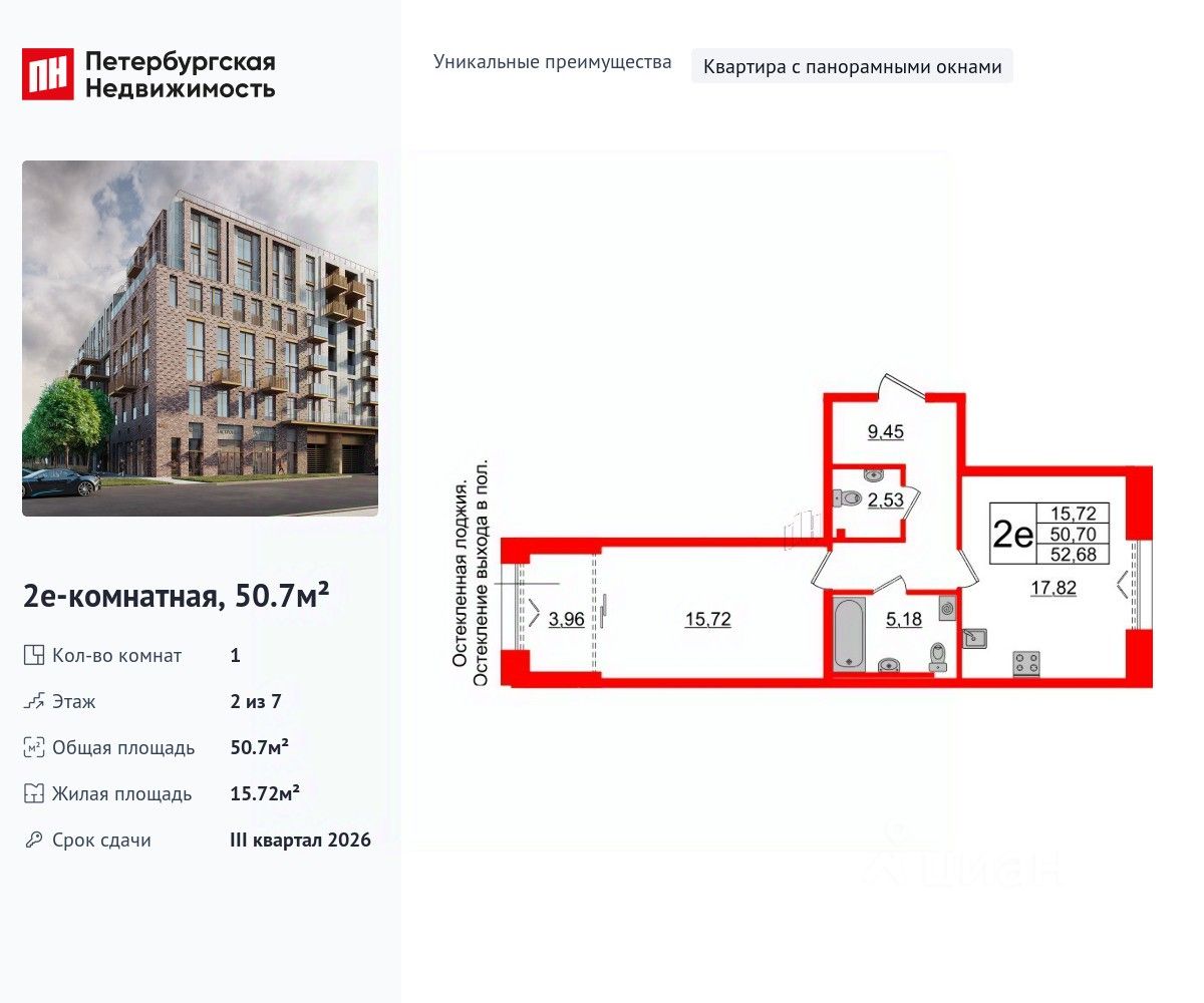 Уникальная, функциональная европланировка, большая кухня-гостиная 17.82 м², просторная прихожая 9.45 м². Общая площадь квартиры - 50.7 м², жилая 15.72 м², высота потолка 3 м.