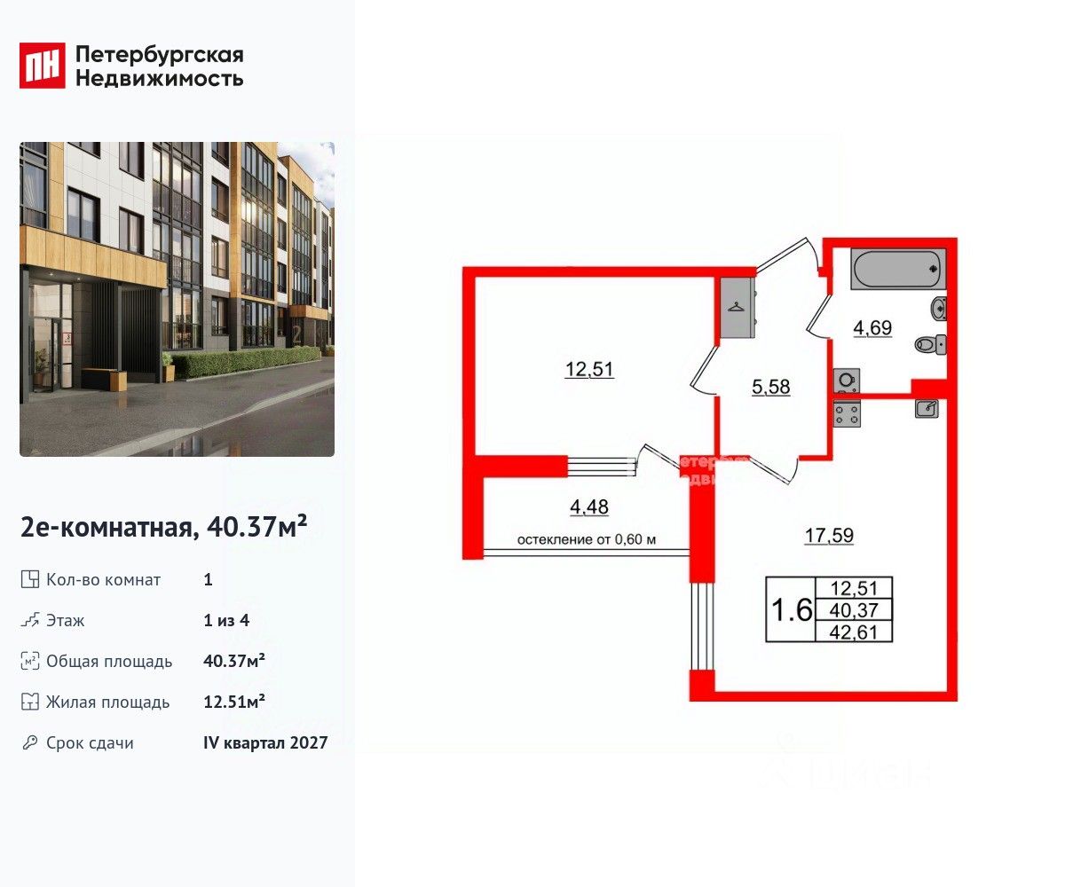 Удобная, классическая, функциональная европланировка, большая кухня-гостиная 17.59 м², просторная прихожая 5.58 м². Общая площадь квартиры - 40.37 м², жилая 12.51 м², высота потолка 2.77 м.