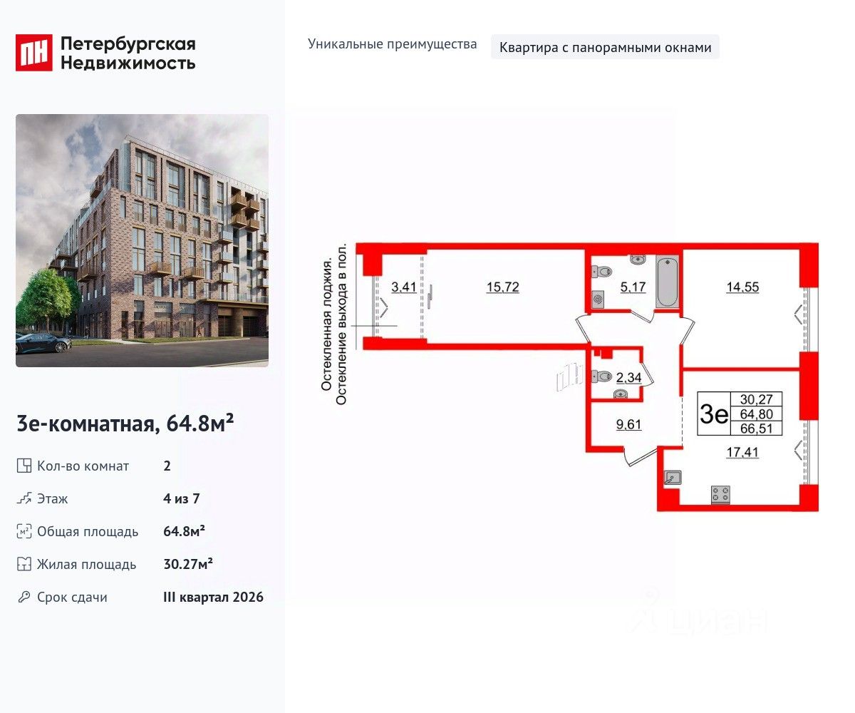 Уникальная, функциональная европланировка, большая кухня-гостиная 17.41 м², просторная прихожая 9.61 м². Общая площадь квартиры - 64.8 м², жилая 30.27 м², высота потолка 3 м.