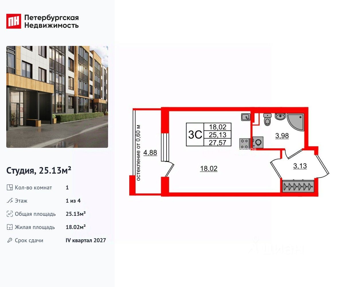 Удобная, классическая, функциональная европланировка, вместительная прихожая 3.13 м². Общая площадь студии - 25.13 м², жилая 18.02 м², высота потолка 2.77 м.