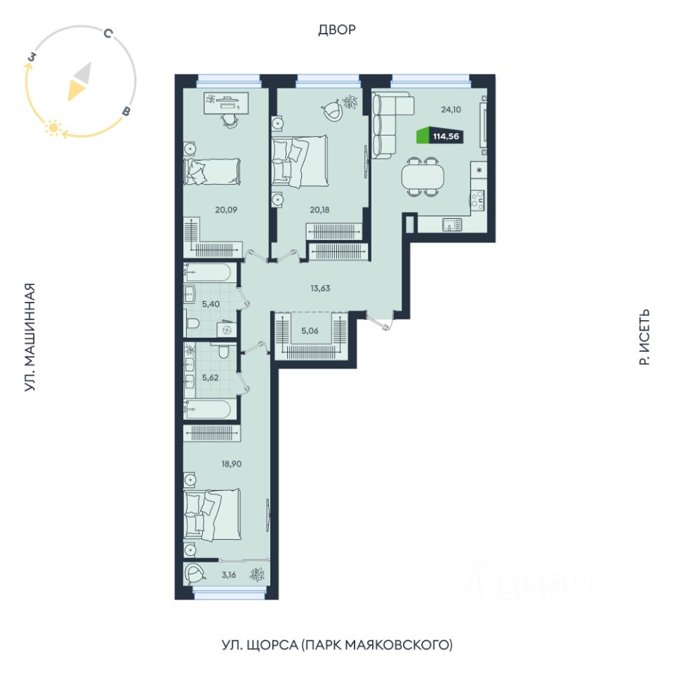 Продаётся 4-комнатная квартира в строящемся доме (Дом 8 (17А-17В)), срок сдачи: III кв. 2027, общей площадью 114.56 кв.м., на 3 этаже. В жилом квартале есть собственный выход в ЦПКиО им. Маяковского для утренних пробежек и отдыха всей семьёй.