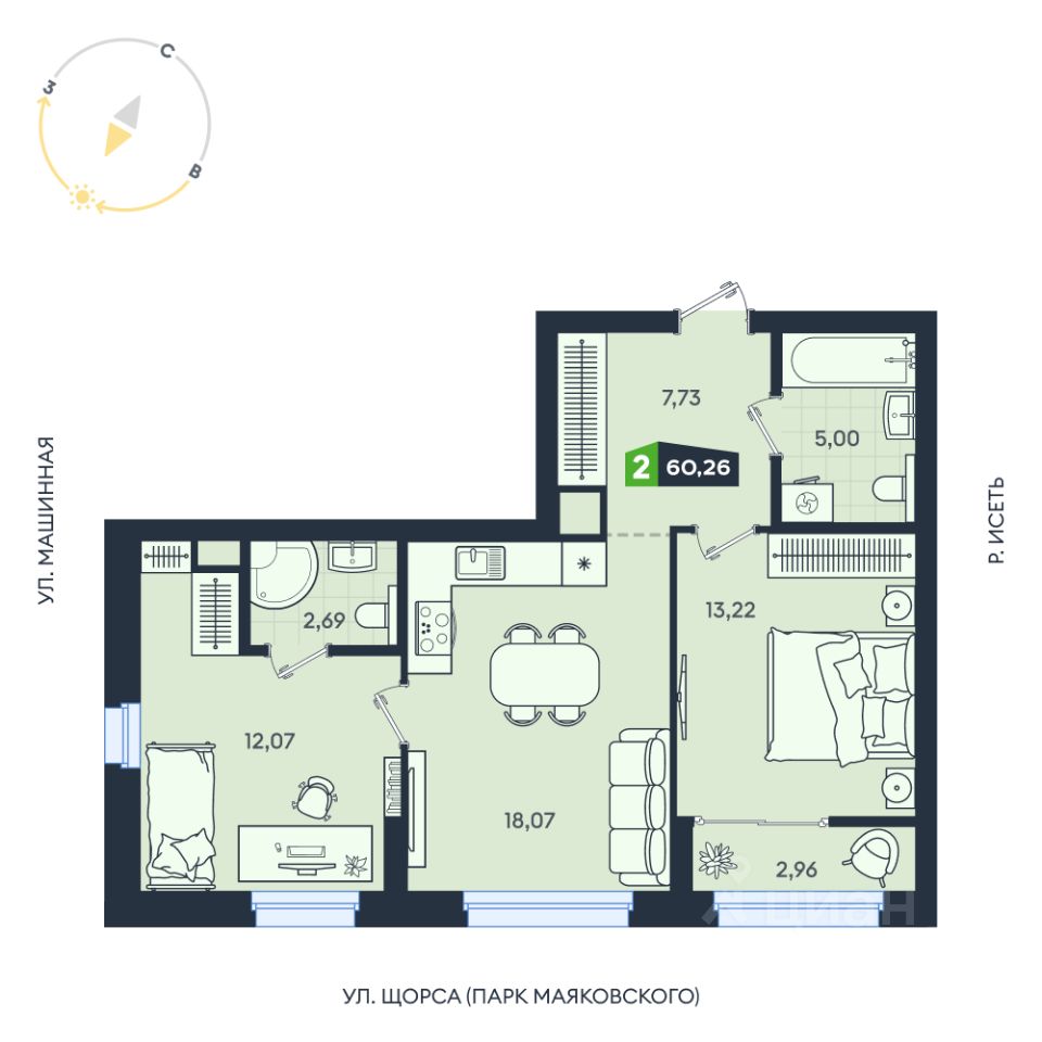 Продаётся 2-комнатная квартира в строящемся доме (Дом 8 (17А-17В)), срок сдачи: III кв. 2027, общей площадью 60.26 кв.м., на 29 этаже. В жилом квартале есть собственный выход в ЦПКиО им. Маяковского для утренних пробежек и отдыха всей семьёй.