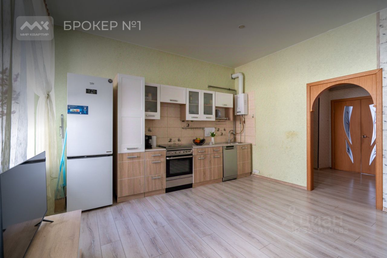 Планировка двусторонняя, просторная кухня-столовая 21 м2, бытовая техника остается покупателю. Большая комната 27 м2 с двумя окнами, с переходом во вторую.