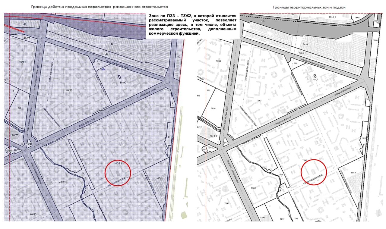 1. Участок в собственности площадью 3663 м² (кадастровый номер 78:12:0006314:23), назначение объект культуры. 2. Участок в аренде площадью 4800 м² (кадастровый номер 78:12:0006314:3006), назначение автостоянка и элементы благоустройства. Общая потенциальная площадь развития территории 8463 м². Согласно правилам землепользования и застройки, зона Т3Ж2 средне- и многоэтажные жилые дома с объектами инфраструктуры, предельная высота застройки до 40 метров.