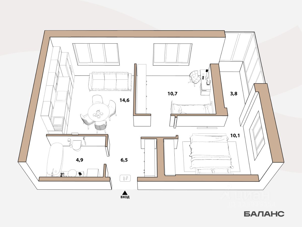 Планировка с отдельной детской комнатой и кухней-гостиной. Дополнительное место для хранении в прихожей. В спальне ниша под шкафы и выход на угловую панорамную лоджию — больше угол обзора.