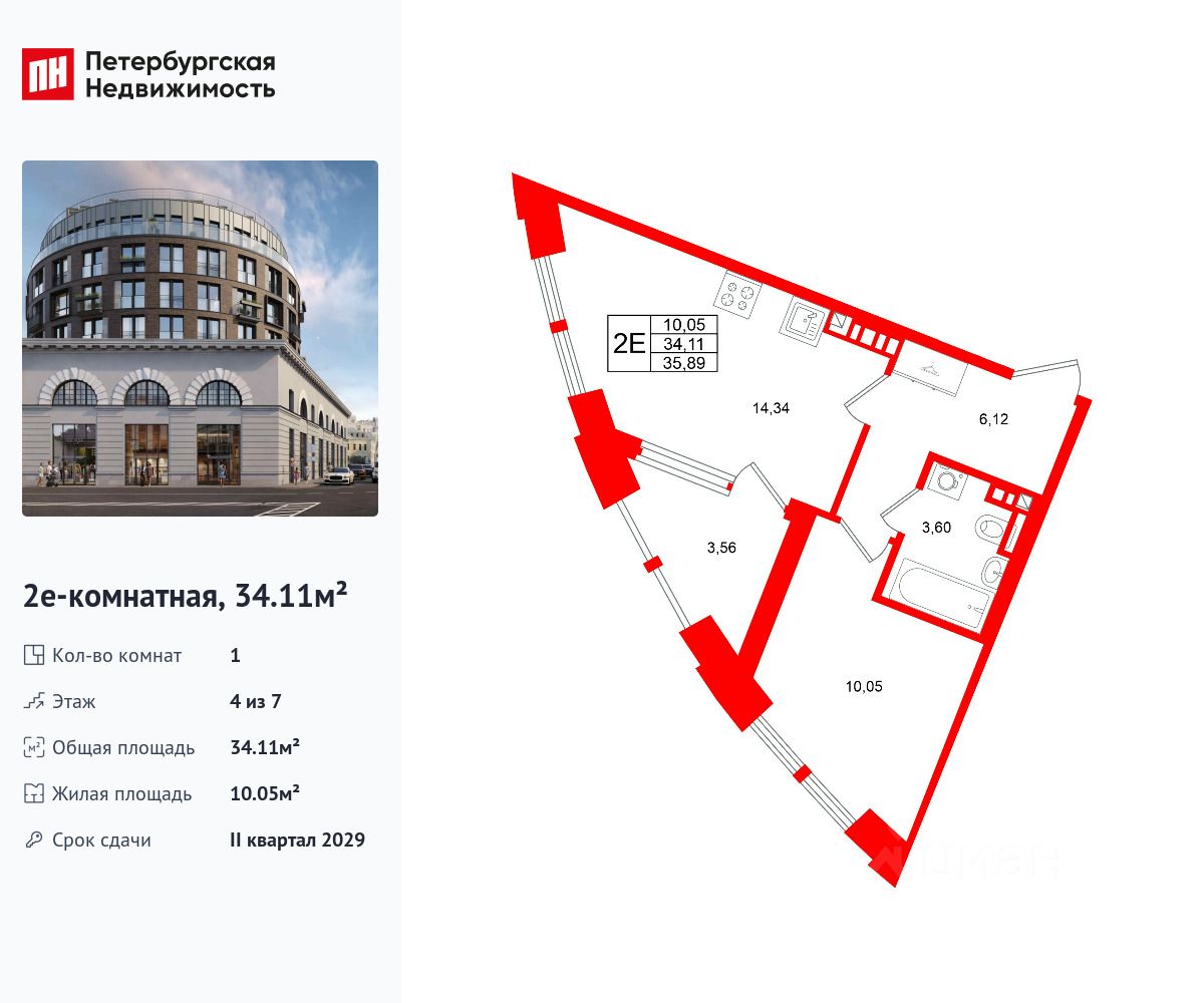 Удобная, классическая, функциональная европланировка, большая кухня-гостиная 14.34 м², просторная прихожая 6.12 м². Общая площадь квартиры - 34.11 м², жилая 10.05 м², высота потолка 3 м.