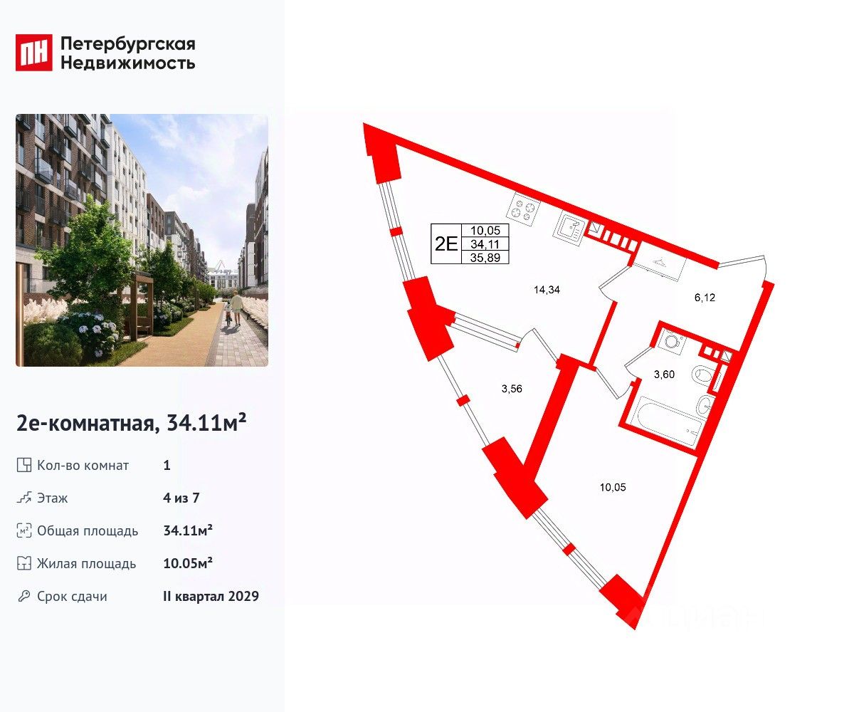 Удобная, классическая, функциональная европланировка, большая кухня-гостиная 14.34 м², просторная прихожая 6.12 м². Общая площадь квартиры - 34.11 м², жилая 10.05 м², высота потолка 3 м.