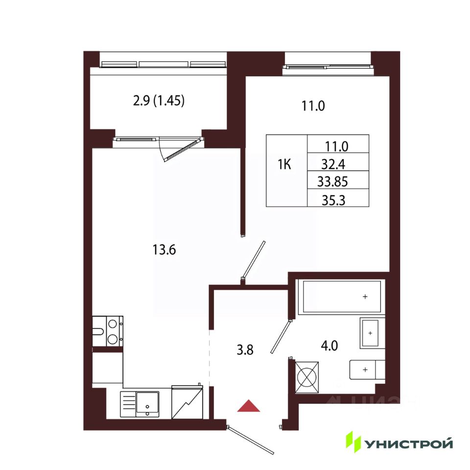 Общая площадь33,85 м2