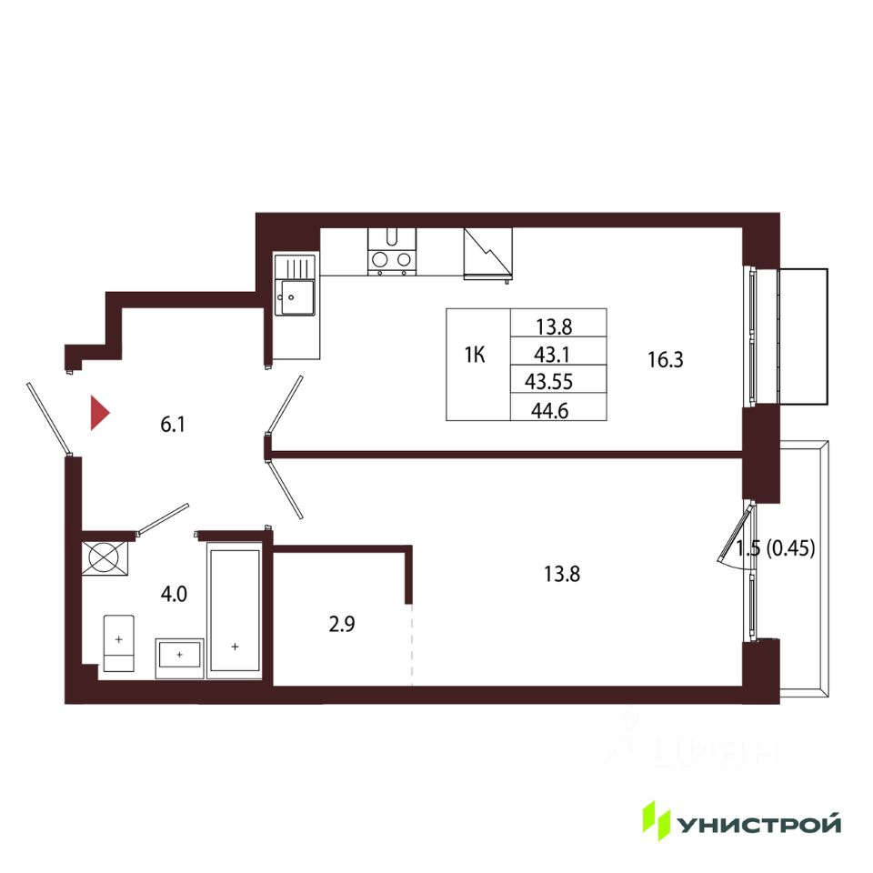 Общая площадь43,55 м2