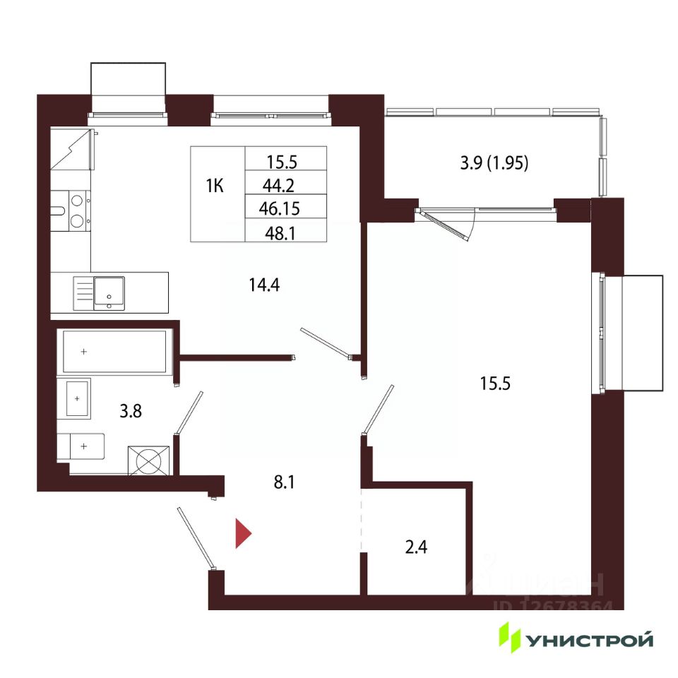 Общая площадь46,15 м2
