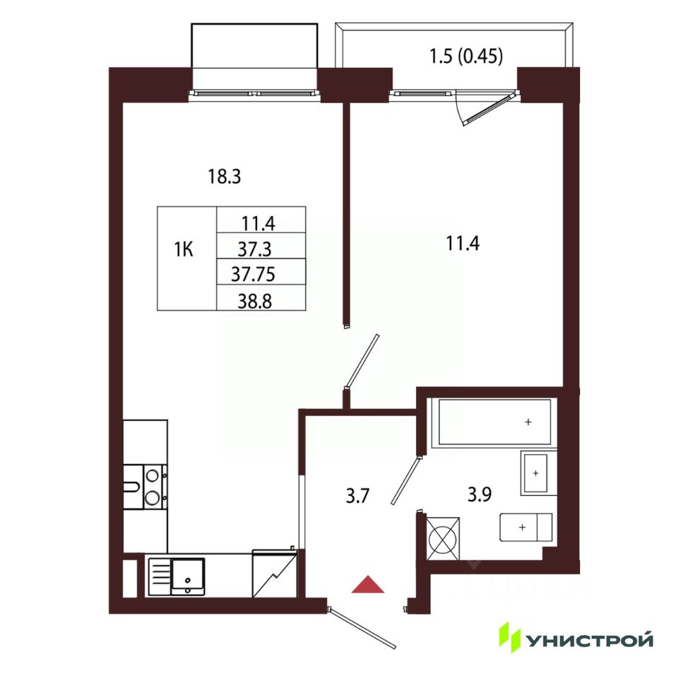 Общая площадь37,75 м2