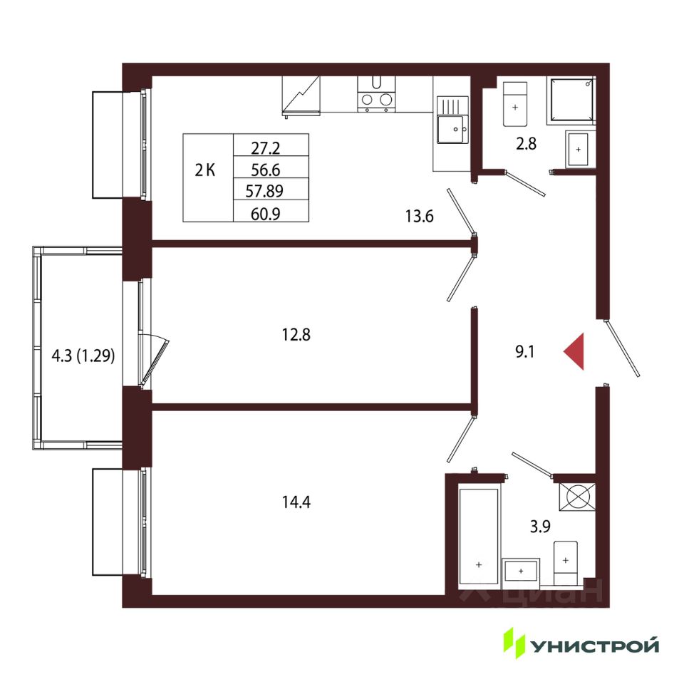 Общая площадь57,89 м2