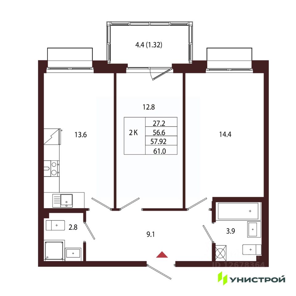 Общая площадь57,92 м2